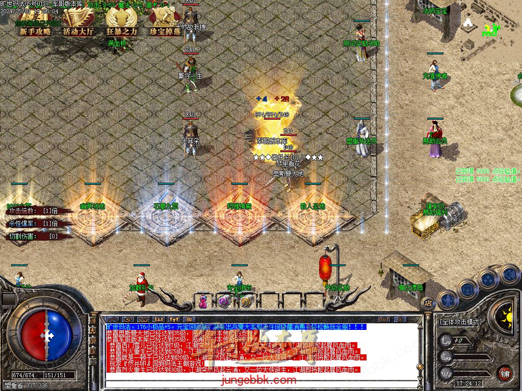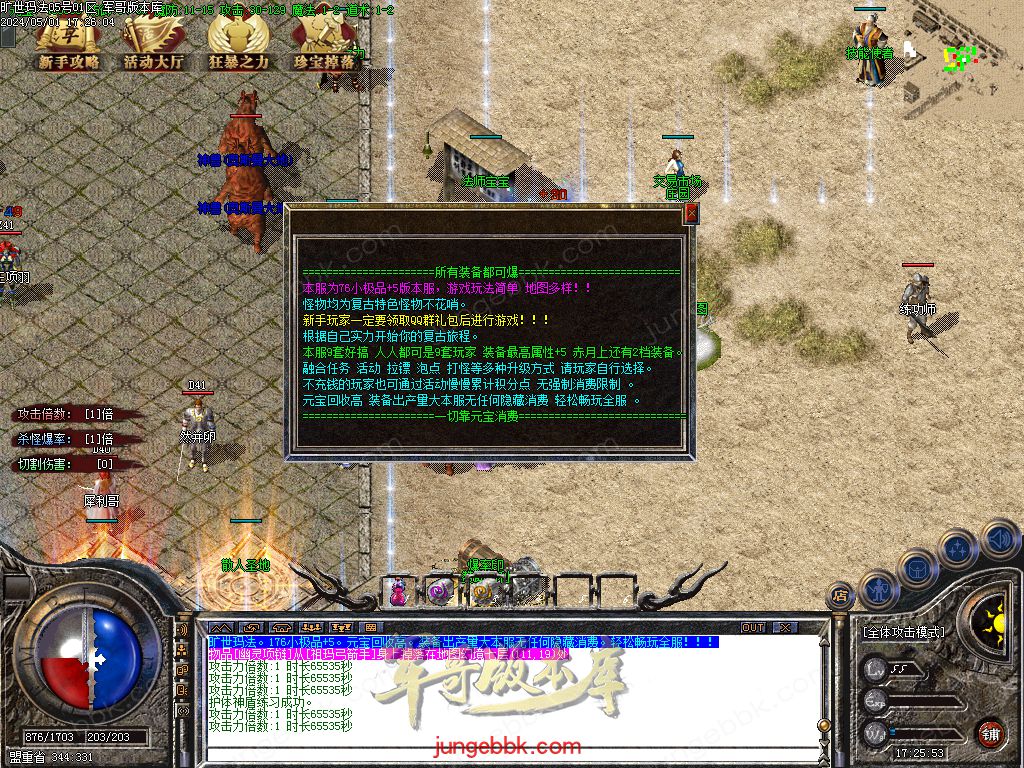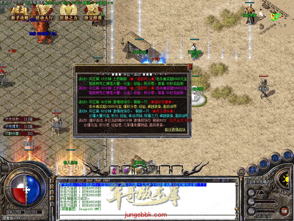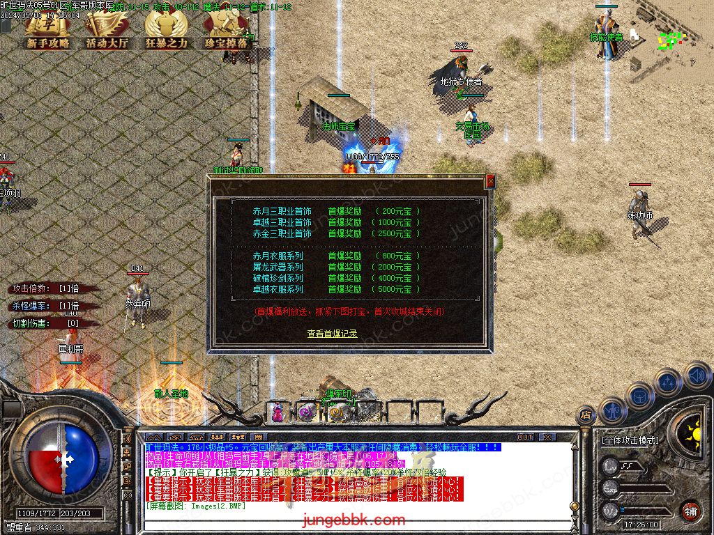 第一次集体攻沙在新区开放第2天中午合区,删除49级以下角色,晚上8点举行!拿沙奖励具体查看攻城管理详情,以及狂暴元宝奖池